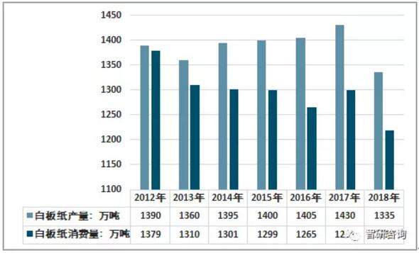 涂布白板紙是在原紙板上涂布白色涂料后,經(jīng)整飾加工制成的機制紙板。涂布白板紙涂布面白度較高,平滑度、油墨吸收性和印刷光澤度都很好,主要用于單面彩色印刷后制作包裝盒。2018年白紙板生產(chǎn)量1335萬噸,較上年增長-6.64%;消費量1219萬噸,較上年增長-6.16%。2009~2018年生產(chǎn)量年均增長率1.67%,消費量年均增長率0.55%。 2012-2018年中國白板紙產(chǎn)量與消費量統(tǒng)計