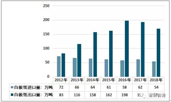截止到2018年,中國白板紙進口量為54萬噸,同比降低12.9%。白板紙出口量為170萬噸,同比下降11.9%。 2012-2018年中國白板紙進出口情況
