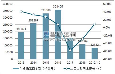 2013-2019年9月中國牛皮紙出口金額趨勢圖