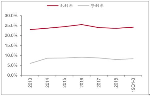 數據來源:公開資料整理 2019前三季度包裝板塊毛利率24.2%,同比提升0.9pct;凈利率8.3%,同比下降0.9pct。費用率方面,銷售費用率4.53%,同比提升0.3pct;管理費用(含研發費用)率8.3%,同比提升1pct;財務費用率1.5%,同比提升0.1pct。 包裝印刷板塊整體毛利率和凈利率
