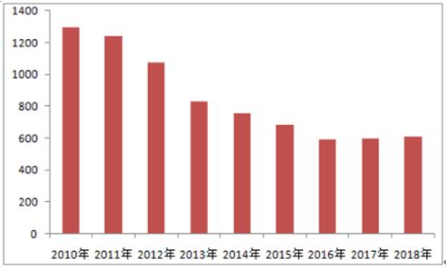 數據來源:公開資料整理 隨著環保政策趨嚴和消費升級的趨勢,非木漿的使用量近年來持續減少,2017年非木漿消耗量597萬噸,2018年為610萬噸,近年來均呈現下降趨勢。我國非木漿的消耗量隨著環保的趨嚴,非木漿消費比例持續呈下降趨勢。蘆葦漿、蔗渣漿、竹漿、稻草漿等非木漿的減少使得木漿系生產過程中非木漿的摻雜逐漸減少,而木漿替代效應凸顯。各主要木漿系紙種,雙膠紙、生活用紙、白卡紙噸紙耗漿均呈現上升趨勢。 2010-2018年我國非木漿消耗逐年降低(單位:萬噸)