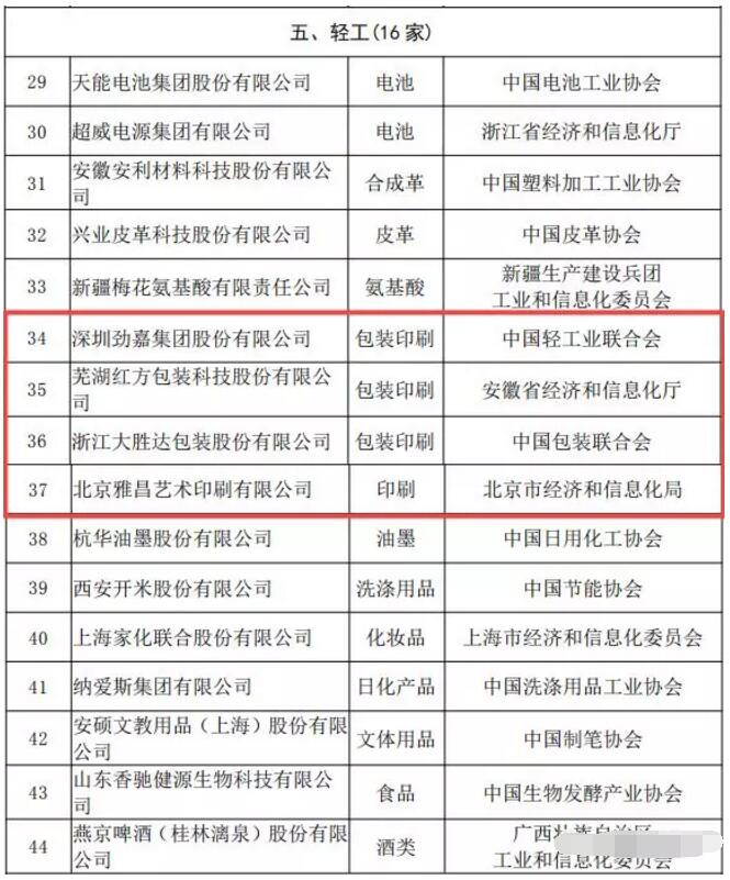 11月25日,工業和信息化部公布了工業產品綠色設計示范企業名單(第一批)。在全國61家工業產品綠色設計示范企業中,深圳勁嘉集團股份有限公司、浙江大勝達包裝股份有限公司、蕪湖紅方包裝科技股份有限公司、北京雅昌藝術印刷有限公司成功入選。