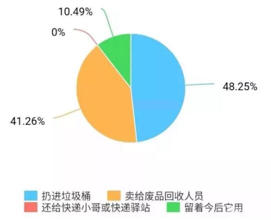 回箱收益不敵派件速度 在派件和退貨高峰期,快遞小哥每天的派件量可能達到500件+,由于公司不提供寄件包裝,他自己負擔的紙箱成本也多了不少。 “為什么不提醒用戶將紙箱還給你們?” “時間來不及,怕影響派件速度。” 據了解,除順豐、京東等少數物流公司外,絕大部分快遞公司的寄件包裝需要站點小哥自掏腰包解決。即便如此,他們寧可掏錢買,也不會問用戶回收紙箱。他們最擔心的,還是送貨不及時。 算一筆簡單的賬,高峰時期,一個快遞小哥一天寄送700多單,平均每個快遞平攤的時間只有1.3分鐘,每單平均收入2元左右,為了加快速度,快遞小哥寧可選擇自掏腰包的智能快遞柜或者快遞驛站。但如果等待客戶拆箱,或者直接送貨上門,勢必造成送單量急劇減少,影響總體速度和收入。 對快遞小哥而言,盡管寄件紙箱要自掏腰包,但畢竟需求量不大,和因等待拆箱而影響的速度相比,自然前者更具有性價比。 從多家電商平臺的回收計劃來看,除了快遞驛站的回收箱,并沒有推出任何針對快遞小哥的獎勵計劃,這也被認為是這些政策很難被實質性執行的主要原因。 在143位問卷受訪者中,近半數表示會將紙箱直接扔進垃圾桶,只有15位表示會留作它用,會歸還快遞小哥或快遞驛站的則無一人。紙箱的直接二次利用率只有10.49%。