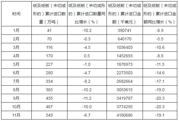 根據中國海關數據顯示:2019年1-11月中國紙及紙板(未切成形的)進口數量為549萬噸,同比下降6.7%;2019年1-11月中國紙及紙板(未切成形的)進口金額為4180686千美元,同比下降19.1%。