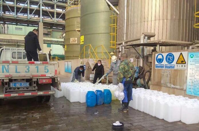 接到命令后,相關部門立即行動起來;瘜W品車間經理楊智勇立即組織各生產班組、生產工程師、維修人員、安全管理人員召開會議,傳達公司決定,安排生產計劃!盀楸WC現有生產安全穩定運行,車間員工主動放棄休假,在自身做好防護措施的前提下輪流上陣,24小時不停歇加班加點調配生產。疫情就是命令,防控就是責任,大疫面前,舍小家,顧大家!”楊智勇表示;瘜W品車間每天要抽調多名員工輪流值班,在料峭寒風的中灌裝次氯酸鈉消毒液。