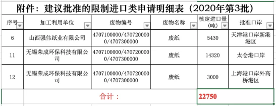2020年2月5日,固廢中心公布的2020年第3批限制進(jìn)口類申請(qǐng)明細(xì)表顯示,山西強(qiáng)偉紙業(yè)有限公司、無(wú)錫榮成環(huán)保科技有限公司共計(jì)廢紙核定進(jìn)口總量為2.275萬(wàn)噸。