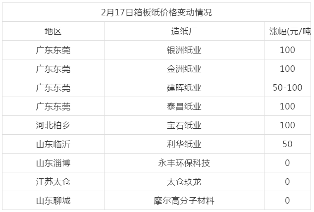 導(dǎo)語(yǔ):從廢紙到原紙、紙板,紙包裝原料市場(chǎng)迎來(lái)春節(jié)后首波價(jià)格上調(diào)。 沉寂近一個(gè)月的原紙市場(chǎng)正式迎來(lái)范圍性漲價(jià)。2月17日,廣東、河北、河南、云南等省份均有造紙廠發(fā)布漲價(jià)通知,包括箱板紙、瓦楞紙,漲價(jià)幅度在50-150元不等。而根據(jù)這些造紙廠的主要銷售地區(qū),其還在對(duì)更大范圍地區(qū)造成影響。 根據(jù)已發(fā)布消息,東莞金洲、銀洲、泰昌、建暉以及河北柏鄉(xiāng)寶石紙業(yè)、山東利華紙業(yè)的部分紙價(jià)都相應(yīng)上調(diào),除了東莞建暉的H級(jí)箱板紙、利華紙業(yè)的仿?q幅為50元以外,其他各紙廠漲幅均為100元/噸。