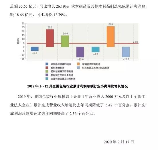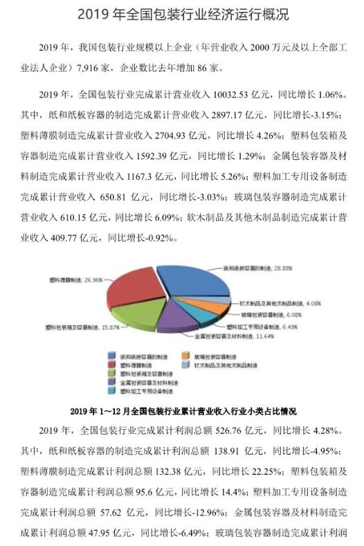日前,中國包裝聯(lián)合會公布了2019年包裝行業(yè)經(jīng)濟(jì)運(yùn)行概況。2019年,我國包裝行業(yè)規(guī)模以上企業(yè)(年?duì)I收2000萬及以上工業(yè)法人企業(yè))為7916家,企業(yè)數(shù)比去年增加86家。 全國包裝行業(yè)完成累計營業(yè)收入10032.53億元,同比增長1.06%,其中紙和紙板容器制造完成累計營業(yè)收入2897.17億元,同比減少3.15%。 全國包裝行業(yè)完成累計利潤總額526.76億元,同比增長4.28%,其中紙和紙板容器制造完成累計利潤總額138.91億元,同比減少4.95%。 包裝行業(yè)規(guī)模以上企業(yè)累計完成營業(yè)收入增速比去年同期降低了5.47%,累計完成利潤總額增速比去年同期增加了2.36%。 2019年包裝行業(yè)經(jīng)濟(jì)運(yùn)行概況
