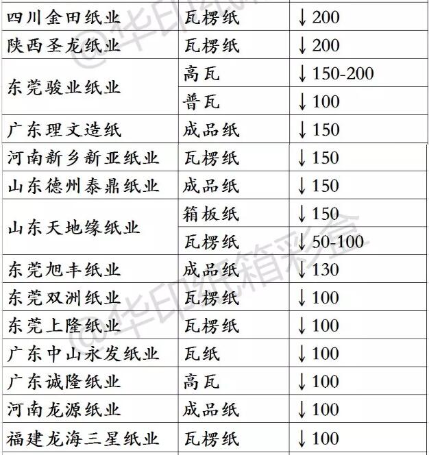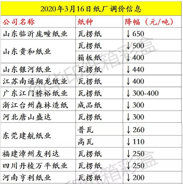 據不完全統計,僅3月16日當天降價的紙廠就有近30家。其中,調價紙種以瓦楞紙居多。降幅最大的紙廠以山東省為首,一次性降幅普遍在400-650元/噸。而一直領跌的東莞紙廠方面,16日當天普遍降幅在100元/噸。