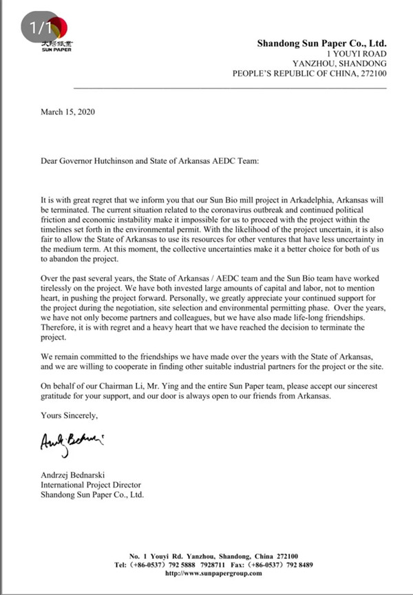 據美國媒體ArkansasTimes當地時間3月16日消息,太陽紙業已經宣布取消其在美國阿肯色州漿紙投資項目。而一個月前,已有美國媒體表示該項目已經擱置,當地著手出售該項目用地。 3月15日,太陽紙業國際項目總監AndrzejBednarski致信阿肯色州州長Hutchinson以及阿肯色州經濟發展委員會(AEDC),表示將終止在該州計劃的SunBio工廠項目。