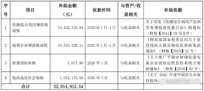 3月31日,浙江榮晟環保紙業股份有限公司發布公告稱,從2020年1月1日至今,公司及子公司累計收到政府補助約為22014912.54萬元,均為與收益相關的各類政府補助。具體明細如下: