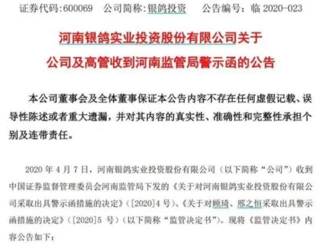 謊言4個月被戳穿 4月8日,銀鴿投資發布公告稱,4月7日,公司收到河南證監局下發的《關于對河南銀鴿實業投資股份有限公司采取出具警示函措施的決定》《關于對顧琦、邢之恒采取出具警示函措施的決定》。 據河南證監局調查,2018年11月21日,銀鴿投資作為保證人與某銀行簽訂最高額保證合同,為控股股東銀鴿集團提供主債權最高限額為6.99億元的保證擔保,而銀鴿投資對該擔保事項未履行審議程序及信息披露義務。 據了解,銀鴿投資這一行為違反了《上市公司信息披露管理辦法》第二條、第三十條和《關于規范上市公司對外擔保行為的通知》第一條等規定。 根據《上市公司信息披露管理辦法》第五十九條規定,河南證監局對銀鴿投資實施出具警示函的行政監管措施,并記入證券期貨市場誠信檔案。 作為銀鴿投資時任董事長顧琦、時任董事會秘書邢之恒,在履職過程中未勤勉盡責,同樣也違反了上市公司信息披露管理辦法的相關規定。河南證監局對顧琦與邢之恒實施出具警示函的行政監管措施,并記入證券期貨市場誠信檔案。 記者了解到,去年12月7日,銀鴿投資發布公告稱,公司已自查2017年至2018年度公司印章使用登記,除公司已披露過的對外擔保事項外,未發現公司在其他擔保協議上加蓋公章的記錄,也未查到相關事項的授權委托記錄。 劇情的反轉,前后經歷了4個月的時間。
