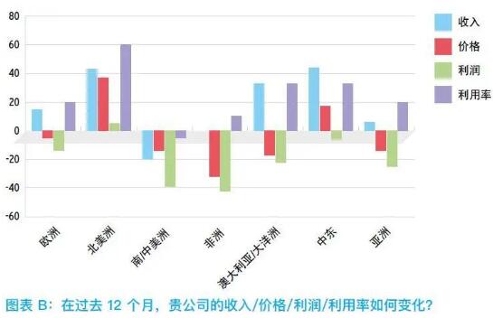如果您對收入、價格、利潤和利用率在過去 12 個月內的變化情況(圖表 B)進行研究,就會明白印刷商保持謹慎的原因。在歐洲和北美以外,雖然中東地區表示情況有所改善,但其他地區的報告顯示,經濟狀況依然嚴峻。對供應商而言,雖然所有地區(澳大利亞/大洋洲除外)的收入都呈增長趨勢,但價格全線下跌,且所有地區都承受著巨大的利潤壓力,無一例外。 印刷商對地區經濟的信心變化 樂觀與悲觀百分比凈差值