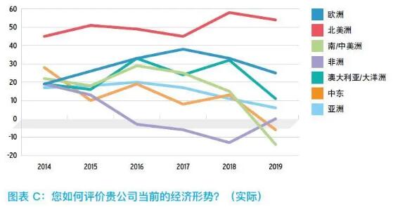 如果查看各區域隨時間的變化(圖表 C),可以發現:北美在過去七年里一直表現活躍;歐洲在2018 年之前呈現穩定增長;其他地區逐漸衰退,只有非洲今年呈現了令人振奮的增長態勢。各地區的供應商都懷著相同的隱憂,雖然相較于去年,他們對非洲、亞洲和中東地區抱持著更樂觀的信心,但仍然以比印刷商更大的幅度調低了明年的業績預測。 全球經濟信心隨時間的變化 樂觀與悲觀百分比凈差值