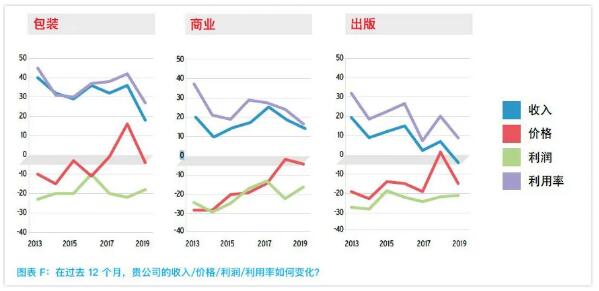 如果我們深入研究三大領域的財務表現數據隨時間所發生的變化(圖表 F),可以看出在所有情況下,印刷商在利潤方面雖然飽受壓力,但能通過增加利用率和收入來成功保持業績,因此在該階段,價格承受的壓力逐漸降低。 2019 年不同印刷工藝的主要印刷量變化(按市場) 樂觀與悲觀百分比凈差值