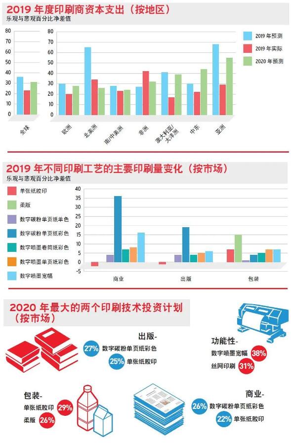 歡迎閱讀第 7 份 drupa 全球趨勢報告執行摘要。這一系列報告非常獨特,主要跟蹤全球七大地區和主要市場領域的關鍵經濟和市場發展狀況。2019 年 11 月(即冠狀病毒疫情爆發前的調查有近八百人參與,涵蓋大多數地區和市場。在此我們由衷地感謝由 2016 年展會的印刷商和參展商組成的 drupa 專家小組。 我們分別向印刷商和供應商分發了一份不同的調查問卷,其中有一些相同的問題,也有一些與每個群體直接相關的具體問題。此次調查共有 581 家印刷商參與,來自歐洲的占微弱多數(353 家),其余來自全球各地,非常具有代表性。供應商的數量明顯較少,但很高興有 189 名供應商參與,其中 119 人來自來自歐洲,同時也很好地覆蓋了其余地區。 調查結果顯示,人們在那時仍保持著樂觀的經濟信心,但態度明顯更加謹慎。發達經濟體非常忌憚貿易戰爭所帶來的威脅,新興經濟體則非常擔心腐敗和政治動蕩所造成的影響。雖然環保減塑活動對有些人來說意味著問題,但是對另一部分人來說卻代表著機遇,因此印刷包裝行業仍在持續增長。毫無疑問,從事出版印刷,以及或多或少涉及商業印刷的人都會對包裝和功能性印刷行業的增長機遇表示羨慕。 在撰寫本文時,冠狀病毒疫情的傳播規模和持續時間尚未可知,但其影響無疑是巨大的,這一點可以從 drupa 展會將延期至 2021 年 4 月的決定中得到印證。但是,無論您服務于哪個市場,在什么樣的社會經濟環境下運營,從調查結果來看,對創新的需求都至關重要。人們對印刷的需求會不斷改變,只有那些了解并能適應這些改變的印刷商和供應商才會蓬勃發展。 2019年drupa印刷商經濟信心指標 樂觀與悲觀百分比凈差值