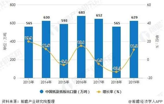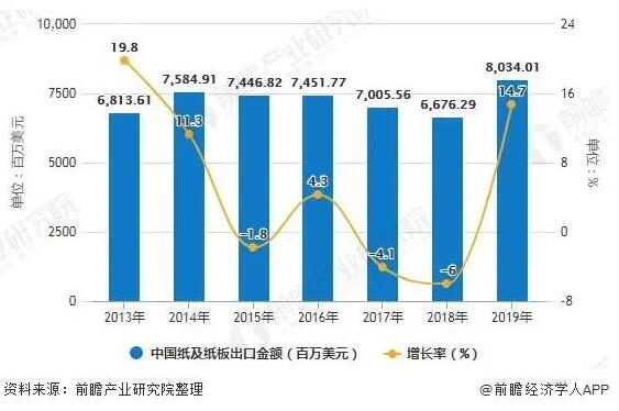 2013-2019年中國紙及紙板出口金額統計及增長情況