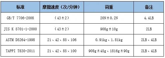 從上表可以看出,國內使用荷重單位和國外不同,但單位之間可以相互轉換。國內的耐磨荷重和摩擦速度同國外稍有差別,但也有聯系。摩擦速度42次/分鐘、43次/分鐘是均有的,也是標準摩擦速度。 為了適應耐磨性差的材料,將摩擦速度降低一半即為21次/分鐘;對于耐磨性較高的材料可以增加速度,85次/分鐘、106次/分鐘或100次/分鐘為標準速度的2倍、2.5倍。 除了增加速度,還可以增加荷重,4LB的荷重恰好為2LB的2倍。這樣對于耐磨性好的材料來說,可以節約測試時間,提高效率。油墨的耐磨性能可以量化,跟有利于控制紙箱彩盒的品質。