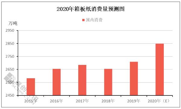 2020年下游各行業發展前景表現不一。紙箱的需求量與下游各行業的發展前景呈現出較高的正相關性。預計2020年瓦楞紙實際消費量約在2358萬噸,同比增速增加4.96%。