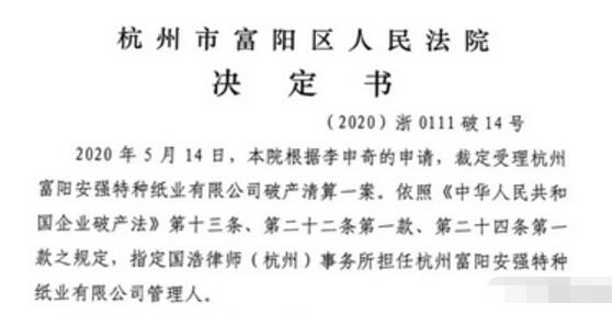 隨著杭州市富陽區騰退造紙行業政策的實施,以及國內造紙行業競爭趨勢的激烈,近年來有越來越多的紙廠走向破產的命運。5月26日,筆者從富陽區人民法院網站獲悉,自2019年底至今的半年時間左右,該法院至少裁定受理了四家紙企的破產清算案。 富陽安強特種紙業 2020年5月14日,杭州市富陽區人民法院根據債權人李申奇的申請,裁定受理杭州富陽安強特種紙業有限公司破產清算一案。據裁定書顯示,申請人之所以申請破產,是因為不能清償到期債務且明顯缺乏清償能力。