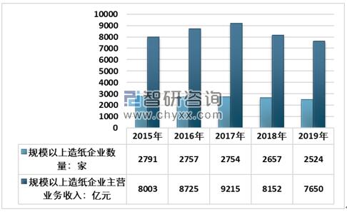 據國家統計局統計的2524家造紙生產企業,2019年1-12月主營業務收入7650億元;受利潤總額下降的影響,國內規模以上造紙企業數量近些年處于下降趨勢。在統計的2524家造紙生產企業中,虧損企業有560家,占22.19%。 2015-2019年中國規模以上造紙企業數量及主營業務收入情況