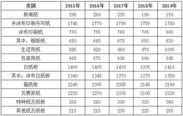 銅版紙消費量535萬噸,較上年下降7.92%;涂布印刷紙消費量542萬噸,較上年下降10.26%;未涂布印刷書寫紙消費量1749萬噸,較上年下降0.11%;新聞紙消費量195萬噸,較上年下降17.72%;生活用紙消費量930萬噸,較上年增長3.22%;包裝用紙消費量699萬噸,較上年下降0.29%;白紙板消費量1277萬噸,較上年增長4.76%;其中,涂布白紙板消費量1216萬噸,較上年增長5.01%;箱紙板消費量2403萬噸,較上年增長2.47%;瓦楞原紙消費量2374萬噸,較上年增長7.28%;特種紙及紙板消費量309萬噸,較上年增長18.39%。 2015-2019年中國紙及紙張細分產品消費情況單位:萬噸