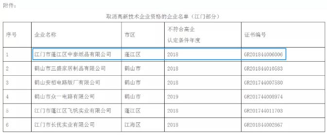 導語:近日消息,廣東省科技廳廣東省財政廳國家稅務總局廣東省稅務局發布聯合通知,取消了江門市蓬江區中泰紙品有限公司等10家企業的高新技術企業資格。高新技術企業被摘帽,會被追繳已享受的補助資金及稅收優惠!