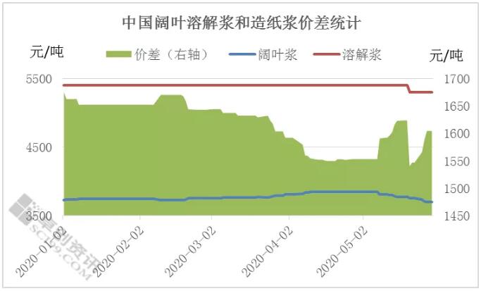 圖2 而造紙市場體量較大,2019年中國木漿需求量3500萬噸以上,且下游紙種品類較多,木漿消耗途徑較多,生活用紙和雙膠紙行業集中度較低,中小紙企原料備貨傾向隨用隨采,溶解漿廠轉產造紙漿利于原料木片庫存消耗和維持生產線運營成本。 后期展望 供應:短期供應來看,溶解漿市場處低利潤,低消耗階段,全球漿廠排產熱情不高。智利Arauco旗下Valdivia工廠55萬噸/年漿線原計劃2019年底轉產溶解漿,但迫于市場需求因素,計劃延期至2020年下半年。Sappi報告顯示,4月溶解漿銷量比計劃低了大約35%。因此公司將減少每個工廠的溶解漿生產,以降低成本,并最大程度地在Cloquet和Ngodwana工廠生產紙漿的機會,以減輕對盈利能力的影響。長期來看今明兩年預計有接近200萬噸新增產能投產,溶解漿市場供應量穩定,且漿線均有轉產造紙漿能力,后期轉產造紙漿仍是溶解漿廠排產方向。 需求:短期來看粘短行業開機負荷率降至年初至今低點,市場價亦創歷史低位,且6月中旬前后,業內或將再度進入督促出貨周期,加之對7月傳統紡織產業需求淡季擔憂情緒,粘短業內價格走勢或仍較為被動。長期來看,今明兩年粘膠短纖國內新增產能35萬噸,溶解漿市場需求端無明顯增量支撐,供需失衡現象暫難緩解。 其他因素:首先國外公共衛生事件尚未出現拐點,粘膠短纖終端服裝行業出口訂單量較少,國內開工復工情況較好,但居民消費能力有所降低,國內終端市場走貨速度下降。其次,心態方面,全球漿廠長期低利潤運轉,短期恢復排產溶解漿積極性不高,而下游粘短市場下行壓力仍存,買漲不買跌心態限制場內交投熱情。 卓創分析,全球溶解漿市場供需兩弱,溶解漿廠家停轉產緩解溶解漿下行壓力,但下游粘膠短纖市場低迷難支撐漿價回升,預計短期溶解漿市場延續供需兩弱狀態,漿價低位盤整。