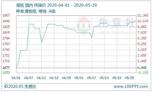 據生意社數據顯示,截止5月29日,廢紙市場A級收購均價為1850元/噸,與5月21日均價1831.43元/噸的均價相比,上調19元/噸,上漲1%;與月初(5月1日)1804.29元/噸的均價相比,上調46元/噸,上漲2.53%。 瓦楞紙市場近期整體穩中小幅上行,140g瓦楞原紙參考出廠價在2850-3150元/噸(含稅)附近。 廢紙市場行情分析 五月,我國國廢市場可謂“跌宕起伏”。直至5月28日,根據對國廢A級黃廢的數據監測顯示,月初至今,市場雖跌宕起伏,但整體走勢上行為主。