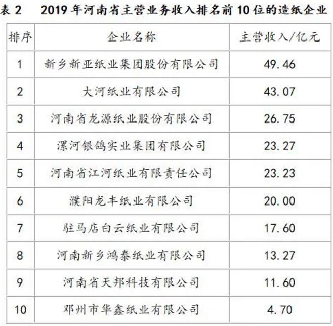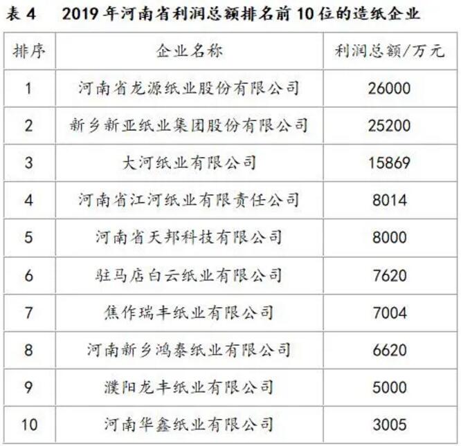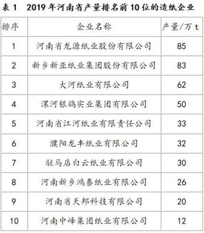1、2019年概況 2019年是河南省造紙行業(yè)形式相對(duì)平穩(wěn)的一年,文化用紙、特種紙、生活用紙都產(chǎn)銷兩旺,包裝紙(箱紙板、瓦楞原紙)企業(yè)產(chǎn)品暢銷,原材料供應(yīng)緊張。根據(jù)河南省造紙學(xué)會(huì)的調(diào)查資料,2019年河南省機(jī)制紙及紙板生產(chǎn)企業(yè)約100家,職工人數(shù)約5萬人,機(jī)制紙及紙板總產(chǎn)量386.8萬t,同比增長2.03%;主營業(yè)務(wù)收入698.5億元(包括紙制品),同比下降8.4%;利潤總額23.56億元,同比下降53.6%。與2018年相比,2019年河南省造紙行業(yè)主營業(yè)務(wù)收入、利稅都有所減少,利潤下滑明顯。 河南造紙企業(yè)主要分布在漯河、濮陽、焦作、新鄉(xiāng)、駐馬店、鄭州等地區(qū),2019年河南省造紙企業(yè)生產(chǎn)能力超過10萬t的企業(yè)有21家,占全省總產(chǎn)量的85%以上;麥草等非木纖維漿造紙產(chǎn)量約8萬t,占全省機(jī)制紙及紙板產(chǎn)量的2.06%,廢紙?jiān)旒埉a(chǎn)量約190萬t,占全省機(jī)制紙及紙板產(chǎn)量的49.10%;木漿造紙產(chǎn)量約189萬t,占全省機(jī)制紙及紙板產(chǎn)量的48.84%。主要產(chǎn)品中,書刊印刷紙、雙膠紙、無碳復(fù)寫紙等文化、工業(yè)用紙約150萬t,箱紙板約90萬t,瓦楞原紙約110萬t,生活用紙約35萬t,其他約2萬t。 河南省所有制漿造紙企業(yè),全部按省和地方生態(tài)環(huán)境部門要求達(dá)標(biāo)排放,很多企業(yè)排放標(biāo)準(zhǔn)高于國家、地方生態(tài)環(huán)境部門標(biāo)準(zhǔn)。部分重點(diǎn)骨干企業(yè)生產(chǎn)和效益有所增加。 2019年河南省重點(diǎn)造紙企業(yè)中完成產(chǎn)量、主營業(yè)務(wù)收入、利稅總額、利潤總額排名前10位的造紙企業(yè)分別見表1~表4。