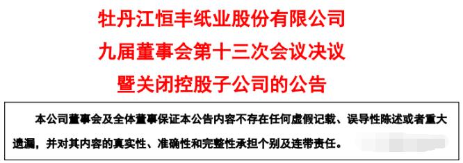 6月7日,牡丹江恒豐紙業股份有限公司召開九屆董事會第十三次會議,審議通過了《關于關閉控股子公司的議案》,同意公司關閉控股子公司湖北恒豐紙業有限責任公司的相關事項。