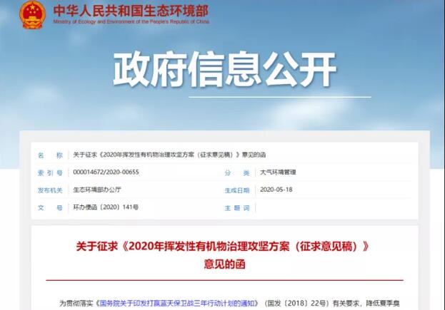 眾所周知,5月18日,生態環境部發布“關于征求《2020年揮發性有機物治理攻堅方案(征求意見稿)》意見的函”: