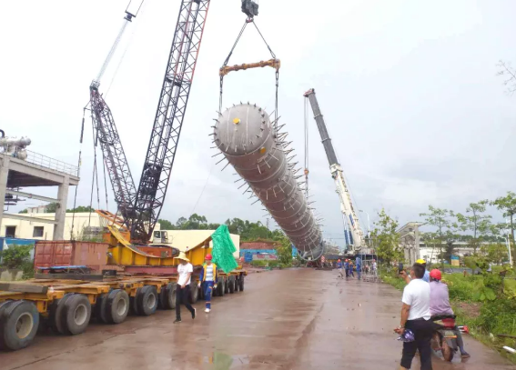 本次運(yùn)輸?shù)碾p氧水反應(yīng)器為超大型設(shè)備,長(zhǎng)48.5米,直徑6.9米,重量達(dá)215噸。由于構(gòu)件體積大,設(shè)備從欽州港碼頭運(yùn)抵金桂施工現(xiàn)場(chǎng)需要通過鐵路匝口,排除海關(guān)圍網(wǎng)及監(jiān)控設(shè)施、高壓電線、通信線路等若干路障,困難重重。