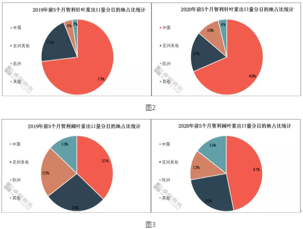 圖1 智利海關(guān)數(shù)據(jù)顯示,2020年1-5月針葉漿總出口量65萬(wàn)噸,較2018年和2019年同期下降25%,而闊葉漿2020年前5個(gè)月總出口量94萬(wàn)噸,較2019年同期下降3%,較2018年仍有上升。可以看出,今年針葉漿出口量出現(xiàn)明顯下滑,而闊葉漿維持穩(wěn)定。卓創(chuàng)分析主要有以下原因: 供應(yīng)端:闊葉漿生產(chǎn)成本低,漿廠產(chǎn)銷積極性高。智利森林資源豐富,國(guó)土面積的55%適合森林生長(zhǎng)。2016年森林覆蓋 面積2421萬(wàn)公頃,約占國(guó)土面積的32%,主要樹(shù)種是輻射松和桉樹(shù)。豐富的森林資源為智利制漿行業(yè)發(fā)展提供了得天獨(dú)厚的優(yōu)勢(shì),而兩個(gè)樹(shù)種的生長(zhǎng)特性也決定著闊葉漿和針葉漿的生產(chǎn)成本。智利闊葉漿原料主要是桉木,桉樹(shù)生長(zhǎng)周期短,輪伐期3-4年,利于快速集中培育;而針葉漿原料主要是輻射松,輪伐期20-25年,培育成本遠(yuǎn)高于桉木。據(jù)智利漿廠公布數(shù)據(jù),2020年一季度闊葉漿現(xiàn)金成本低于針葉漿120美元/噸,且利潤(rùn)空間較大,漿廠排產(chǎn)銷售積極性較高。 需求端:針、闊葉價(jià)差擴(kuò)大 針葉漿需求減少。從圖1可以看出,近三年智利漂白化學(xué)漿出口均價(jià)持續(xù)下行,而闊葉漿下行幅度更大,從而導(dǎo)致2020年前五個(gè)月針葉漿與闊葉漿價(jià)差達(dá)到95美元/噸,是2019年同期4倍以上。不斷拉大的價(jià)差和闊葉漿不斷走低的價(jià)格,促使下游紙廠在保證正常生產(chǎn)的情況下,不斷調(diào)低針葉漿使用比例。 2.出口流向:針闊葉流向重心出現(xiàn)分化 闊葉漿成亞洲市場(chǎng)“新寵”