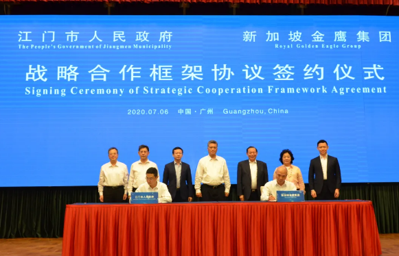 7月6日下午,江門市政府與新加坡金鷹集團旗下亞太森博(廣東)紙業有限公司簽訂高達200億元的合作框架協議。廣東省委副書記、省長馬興瑞、副省長張新、省政府秘書長葉牛平、新加坡金鷹集團主席陳江和及其夫人黃瑞娥、董事陳建升等出席活動并見證簽約。