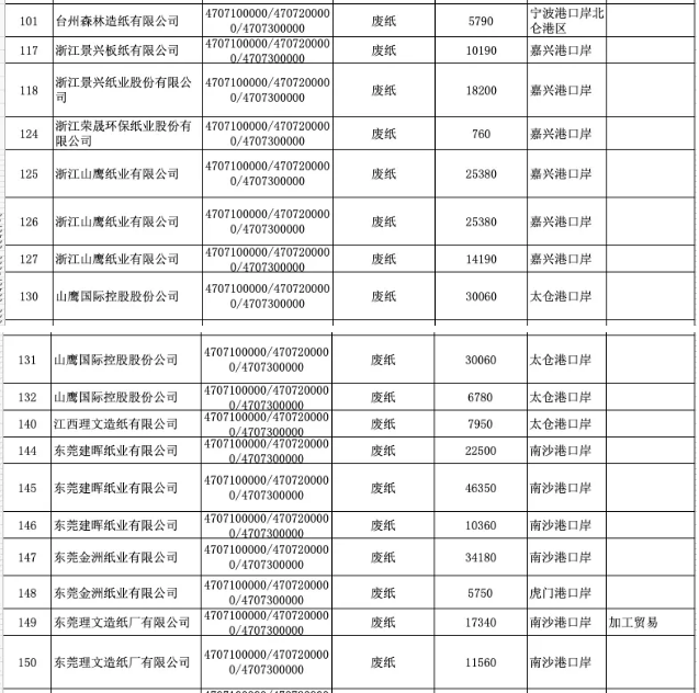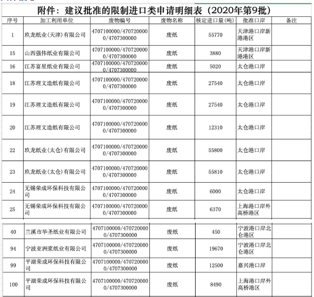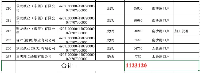 2020年7月6日,固廢中心公布的2020年第九批限制進口類申請明細表顯示,審核通過了共計廢紙核定進口總量為112.312萬噸。