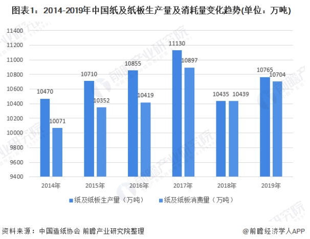 造紙行業(yè)作為中游制造行業(yè),上游對接紙漿,下游是包裝行業(yè)。造紙行業(yè)具有較強(qiáng)的周期屬性,從2007年至今經(jīng)歷了宏觀經(jīng)濟(jì)以及產(chǎn)能投放影響下的完整周期,目前隨著環(huán)保趨嚴(yán)的持續(xù)影響,原料供給受限導(dǎo)致成本上漲,導(dǎo)致中國造紙行業(yè)相關(guān)企業(yè)盈利空間縮小。 供需均有回升 據(jù)中國造紙協(xié)會統(tǒng)計(jì)數(shù)據(jù)顯示,2014年以來,我國紙及紙板產(chǎn)量整體呈現(xiàn)震蕩上行趨勢,增速保持在低位運(yùn)行。2017年我國紙及紙板生產(chǎn)量首次突破11000萬噸,創(chuàng)歷史新高;2018年,受行業(yè)景氣度下滑影響,整體產(chǎn)量小幅下滑,到2019年,我國紙及紙板生產(chǎn)量有所回升,累計(jì)產(chǎn)量為10765萬噸,同比增長3.16%。消耗量方面,據(jù)中國造紙協(xié)會統(tǒng)計(jì)數(shù)據(jù)顯示,2014年以來,我國紙及紙板產(chǎn)量整體呈現(xiàn)震蕩上行趨勢,增速保持在低位運(yùn)行。2018年,我國紙及紙板消費(fèi)量出現(xiàn)下滑,2019年消耗量回升至10704萬噸。