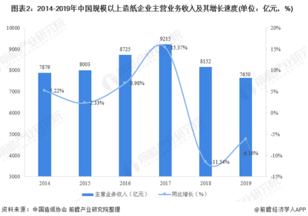 企業(yè)營收出現(xiàn)下滑 據(jù)中國造紙協(xié)會統(tǒng)計(jì)數(shù)據(jù)顯示,2014-2017年,我國規(guī)模以上造紙企業(yè)主營業(yè)務(wù)收入穩(wěn)步提升,2018年以來,隨著我國造紙行業(yè)落后產(chǎn)能淘汰工作的持續(xù)深入以及原材料價(jià)格波動影響,我國規(guī)模以上造紙企業(yè)主營業(yè)務(wù)收入有所下滑,2019年,全國規(guī)模以上造紙企業(yè)主營業(yè)務(wù)收入為7650億元,同比下降6.16%。在統(tǒng)計(jì)的2524家造紙生產(chǎn)企業(yè)中,虧損企業(yè)有560家,占22.19%。