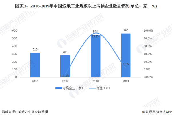 虧損企業(yè)數(shù)量上升 國內(nèi)造紙行業(yè)的生產(chǎn)企業(yè)眾多,產(chǎn)品的同質(zhì)化現(xiàn)象較嚴(yán)重,多集中在中低端產(chǎn)品,企業(yè)對于高端產(chǎn)品的研發(fā)和生產(chǎn)缺乏一定的競爭力。此外,造紙行業(yè)屬于高耗能高污染行業(yè)。自2015年以來,國家出臺一系列環(huán)保相關(guān)法律法規(guī),進(jìn)一步提高了造紙行業(yè)門檻和環(huán)保排放標(biāo)準(zhǔn),環(huán)保政策的趨嚴(yán)給造紙業(yè)帶來了巨大的成本壓力,造紙行業(yè)部分無法適應(yīng)環(huán)保政策變化的企業(yè)由之前的盈虧狀況轉(zhuǎn)為為虧損狀態(tài)。 從近幾年的具體數(shù)據(jù)來看,2016-2019年我國造紙工業(yè)規(guī)模以上虧損企業(yè)數(shù)量總體呈逐年增長態(tài)勢,增速波動較大。2018年行業(yè)規(guī)模以上虧損企業(yè)數(shù)量達(dá)543家,同比增長93.2%,受宏觀環(huán)境消極影響較大。2019年我國造紙工業(yè)規(guī)模以上虧損企業(yè)數(shù)量為560家,同比上漲3.1%。