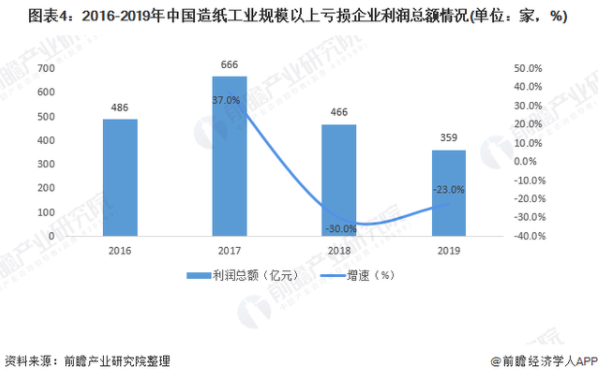 企業(yè)利潤連續(xù)三年下降 2016-2019年我國造紙工業(yè)生產(chǎn)企業(yè)利潤總額總體呈波動下降態(tài)勢,近兩年降幅較大。2019年我國造紙工業(yè)規(guī)模以上企業(yè)利潤總額為359億元,同比2018年下降了23%,降幅達(dá)到兩位數(shù)。