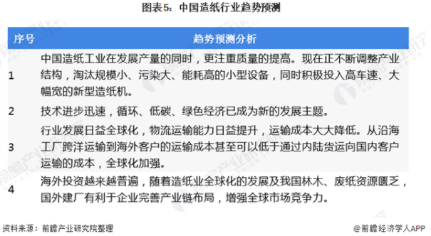中國造紙行業(yè)發(fā)展趨勢預(yù)測 隨著國家進(jìn)一步提高造紙行業(yè)門檻和環(huán)保排放標(biāo)準(zhǔn),造紙行業(yè)落后產(chǎn)能的關(guān)停速度將會被加快。我國造紙行業(yè)中小企業(yè)面臨關(guān)停的生存危機(jī),在環(huán)保趨嚴(yán)態(tài)勢下,行業(yè)整體運(yùn)營成本上升,盈利空間縮小。行業(yè)正處于產(chǎn)業(yè)升級與整合期。可以預(yù)見隨著行業(yè)整合,行業(yè)集中度也將隨之提高,行業(yè)競爭也將越來越激烈。這些都將會迫使我國造紙行業(yè)加速產(chǎn)業(yè)結(jié)構(gòu)調(diào)整,未來將更注重質(zhì)量;更關(guān)注行業(yè)技術(shù)創(chuàng)新,企業(yè)也將不斷走出國門,走向國際。