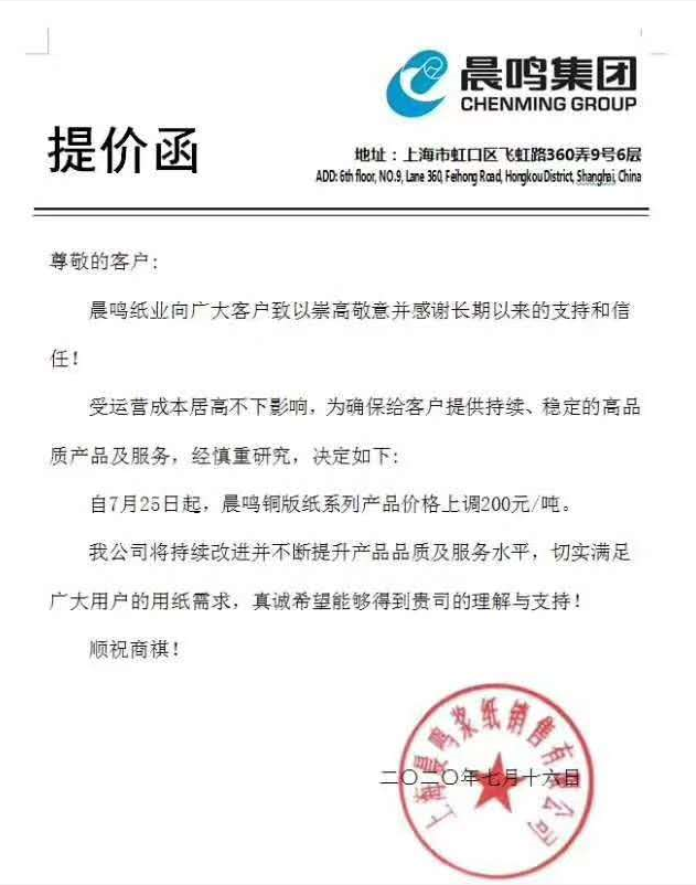 近日,文化紙大廠晨鳴、華泰、太陽紙業發布文化紙漲價函,銅版紙、雙膠紙價格上調200元/噸,晨鳴為7月25日執行外,另外兩家企業均為8月1日開始執行新的價格標準。 上海晨鳴漿紙銷售有限公司 受運營成本居高不下的影響,為確保給客戶提供持續、穩定的高品質產品及服務,經慎重研究,決定如下: 自7月25日起,晨鳴銅版紙系列產品價格上調200元/噸。