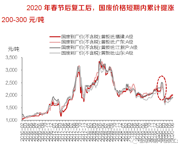 眾所周知,外廢政策如期執行,預計2020底中國將基本實現外廢零進口,造紙行業原材料結構或將發生重大變化。進口廢紙作為中國造紙原材料中的重要組成部分,2016-2019 年進口廢紙占中國紙漿總消耗量的比重分別達24%、21%、16%、10%。2017年以來中國廢紙進口政策持續收緊,一系列進口廢紙相關改革措施陸續出臺,根據2018年6月24日國務院公布的《中共中央國務院關于全面加強生態環境保護堅決打好污染防治攻堅戰的意見》,2020年底中國將基本實現外廢零進口,根據目前的情況來看,預計外廢政策將如期執行。 受廢紙進口政策調整影響,2017 年至今廢紙進口量逐年收縮,2017年、2018年、2019年中國廢紙進口量分別達2572、1703、1036萬噸,同比下滑10%、34%、39%。推測2020年進口廢紙將持續減量至600萬噸,直至2020 年底基本實現零進口。假設預留新聞紙所需外廢原材料,預計2021 年及以后每年的外廢進口量將保持在200萬噸左右。未來中國造紙行業原材料結構中,進口廢紙的比重逐年減小,國廢及木漿占比有望逐步提升。 聚焦廢紙系產業鏈原材料環節,預計2020-2021年廢紙系原材料供需將整體處于緊平衡狀態,而終端需求回暖、國廢回收率受限將成為短期內打破此種平衡、促成廢紙缺口顯現的關鍵要素。進口廢紙作為廢紙系原材料供給端的重要組成部分,伴隨外廢政策如期執行,預計2021年外廢進口量相比2019年將下降836萬噸至200萬噸;由此帶來的高品質纖維缺口將由進口廢紙漿、原生漿、國廢等替代纖維填補,由于廢紙漿、原生漿布局未來投產規模有限,國廢供給量受國廢回收率制約,未來廢紙系原材料存在供給邊界,因此未來1-2年廢紙缺口會否出現將與廢紙總需求量的走向直接相關。 需求端,廢紙總需求量受箱板瓦楞紙終端需求影響較大,與經濟活動高度相關,經歷了2018年下半年終端需求顯著下滑、2019年小幅回暖后,2020年年初以來疫情對全球經濟帶來的沖擊,再一次導致廢紙系原材料總需求整體回落。站在當前時點展望未來1-2年,受進口廢紙漿、原生漿以及進口成品紙等海內外自建項目投產節奏影響,在需求端偏弱、供給端存在約束的情形下,若2020年全年箱板瓦楞紙需求相較2019年降幅在5%以內,則廢紙缺口將有望顯現;若2020年需求較弱,但2021年箱板瓦楞紙需求量相比2019年增長超過5%,則廢紙缺口亦將有望于2021年顯現。據此預計2020-2021年廢紙系原材料供需將整體處于緊平衡狀態,而終端需求回暖、國廢回收率約束將成為打破平衡、決定廢紙缺口會否顯現的關鍵變量。 未來1-2年,商品廢紙漿、國廢價格有望于需求旺季迎來上漲。終端需求變化、國廢回收率約束是決定未來1-2年廢紙缺口會否顯現的關鍵要素,整體而言: 箱板瓦楞紙需求對廢紙需求端的影響程度大于對供給端的影響,因此當終端需求回暖帶來廢紙總需求增長時,預計廢紙總供給增速將不及廢紙總需求增速,廢紙缺口將顯現,且伴隨終端需求增速提升、廢紙缺口將進一步擴大,終端需求回暖將成為加劇廢紙供需緊張的“反饋放大器”。 當廢紙供給端國廢回收率提升受限時,廢紙缺口在需求較弱的情形下仍有可能顯現,2020年春節復工后,國廢價格因供給端回收率受限導致的快速上漲即是例證。由此可見,需求回暖將是短期內打破廢紙系原材料供需緊平衡、導致廢紙缺口顯現的關鍵原因,如若國廢回收率提升受限,也將在短期內造成廢紙供需緊張的局面出現。因此,在年內需求旺季這一需求改善的窗口期,商品廢紙漿、國廢價格均有望迎來階段性上漲。 基于廢紙系產業鏈動態循環視角,需求回暖情形下,2020-2021年廢紙缺口有望出現 廢紙系產業鏈具備動態循環特征,廢紙系原材料總需求量受箱板瓦楞紙等成品紙消費量的影響發生變化,與此同時,這些成品紙又構成了廢紙系產業鏈的供給原材料,也即意味著需求同時構成供給。針對國廢總回收量上限的測算均以2019年國內紙及紙板消費量為基數,即假設2021年相比2019年需求不再下滑,由此得到2021年國廢總回收量最多達5562萬噸。然而,考慮到中國的廢紙循環周期較短(國廢價格快速上漲時,從紙箱消費到廢紙回收、再到紙箱的生產,整個過程僅需3-4個月),終端需求下滑帶來箱板瓦楞紙產量下降、廢紙總需求量下滑的同時,可用作造紙原料的國廢回收量也會相應減少,未來國廢總回收量的上限值也將相應下降。即需求影響供給。