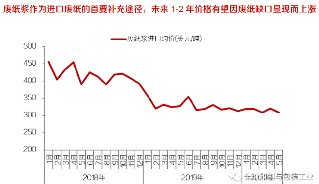 未來1-2年國廢價格有望于需求旺季迎來上漲 國廢價格走勢取決于其自身的供需關系,終端需求變化與國廢回收率是影響其供需格局的兩大關鍵要素。 ·供給端,國廢供給量即國廢總回收量,與國廢回收水平直接相關,若國廢回收率提升受限,國廢供給增速或將不及需求增速,進而導致國廢供需緊張;需求端,國廢需求量=①廢紙總需求量-②其他廢紙系原材料供給量,其中:①廢紙總需求量由國內廢紙系紙品產量直接決定,即廢紙系紙品消費量中難以被進口成品紙滿足的部分,由箱板瓦楞紙終端需求主導,受內需、出口影響程度較高,存在不確定性;②其他廢紙系原材料供給量,即進口廢紙、廢紙漿、原生漿等高品質纖維供給量之和,伴隨進口廢紙逐年減量,若廢紙漿、原生漿等高品質替代纖維供給量增加幅度不及廢紙進口量下降幅度,需求轉暖的情形下,國廢替代性需求將相應增加,或將觸及供給邊界,國廢缺口或將顯現,國廢價格即有可能上漲。 ·復盤國廢價格表現,2016年以來國廢價格的兩輪周期頂點分別出現于2017年10月、2018年5月底至7月初,供需緊張的情況下價格均上漲至3000元/噸以上。2016年以來,國廢價格兩輪顯著上漲分別出現于2017年8-10月、2018年5月底至7月初。 ·2017年8月起,旺季因素疊加進口廢紙減量預期,國廢價格出現較大幅度上漲,由8月初的2000元/噸上漲至3150元/噸,10月中下旬受終端需求下滑、廢紙貿易商去庫存等因素影響,國廢價格顯著回落。 ·國廢價格第二輪顯著上漲出現于2018年上半年,外廢進口量減少,國廢原材料需求增加,國廢價格由年初2100元/噸上漲至3300元/噸。其中,5月漲價提速主要是受到了美廢政策收緊后廢紙進口量大幅下滑的影響,加劇了國內廢紙供應緊張的局面,國廢價格快速提升。2018年6月起箱板瓦楞紙終端需求不及預期,并通過成品紙傳導至上游國廢原材料需求,進而導致國廢價格自7月初開始下跌,8月小幅上漲后繼續回落。