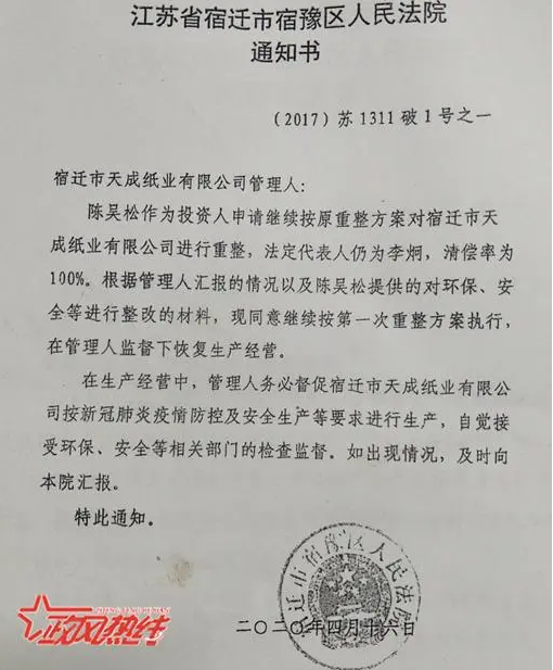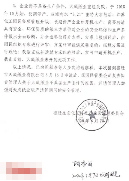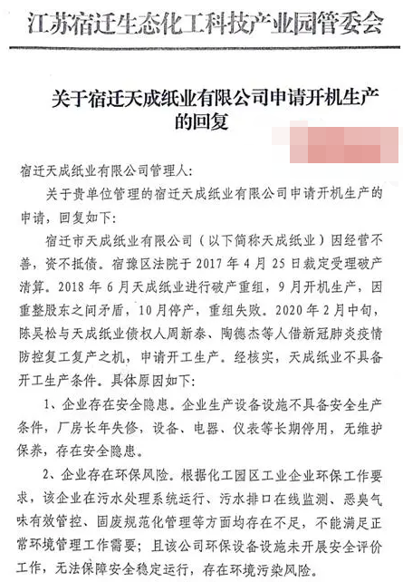 一面說企業存在問題不能復工,一面又不給企業提出具體問題整改清單。申請企業復工5個月后,6月28日宿遷生態化工園給出了書面回復:天成紙業不具備開機生產條件。原因有三:企業存在安全隱患;企業存在環保風險;重組失敗企業不具備生產條件。 3、企業莫名遭遇“被破產” 對于宿遷生態化工園管委會這個回復,宿遷天成紙業一一給出了回應。 關于存在安全隱患問題。陳吳松說,管委會說法與事實不符。他介紹,宿遷天成紙業于2019年11月28日進場開展檢修,設備均已檢修,線路、電器、儀表燈均已檢修更換完畢,并非長期停用,無維護保養。宿豫區人民法院于2019年11月27日通知宿遷市天成紙業有限公司投資人可以進場開展檢修,企業于2019年11月28日進場開展檢修,進場第一時間向管委會及安監環保部門書面匯報。2019年12月至2020年2月管委會安監環保部門多次到場檢查,檢查結果均為合格,不存在所謂的安全隱患問題。 關于環保風險問題。陳吳松介紹,企業污水處理系統恢復運行;污水排口安裝在線監測設備;生產工藝已進行改進,不存在惡臭氣味;生產過程中產生固廢也可規范化處理;環保設施安全評價可在企業試生產后開展,目前停產期間無法開展。環保檢查中,僅提出將廠內一廢棄放射源及時處理,企業已于2020年1月16日將廢棄放射源送至江蘇省核與輻射安全監督管理中心合規處理,不存在所謂的環保風險。