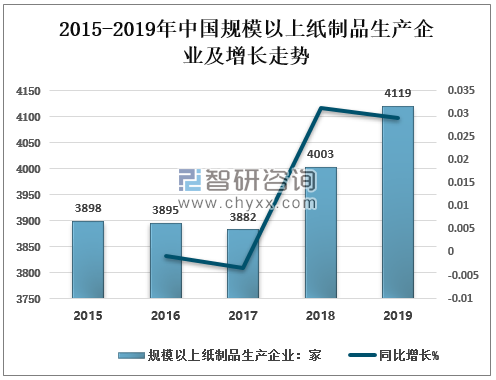 二、我國紙制品行業發展現狀分析 1、紙制品產消量分析 隨著供給改革和產業結構調整,部分產品產能結構性問題將進一步得到改善。同時,隨著環保政策的細化和部分地區產業結構的調整,市場結構的一些變化都將為部分企業帶來商機和發展機遇。 據國家統計局數據,2018年全國規模以上紙制品生產企業4003家,2019年全國規模以上紙制品生產企業4119家,同比增長2.9%。 2015-2019年中國規模以上紙制品生產企業及增長走勢
