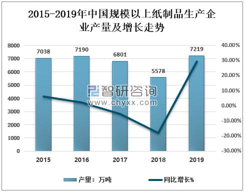 資料來源:中國造紙協會、智研咨詢整理 在金融危機后,造紙行業在四萬億的刺激下業績明顯回升,主要紙張種類的價格都企穩回升,這一階段規模以上企業產品銷售收入增長速度較快。受宏觀經濟以及物流行業快速發展等因素影響,紙及紙板產量明顯上升,行業營業收入和盈利能力均有所回升,但整體需求增長仍較疲。2018年國內紙漿造紙及紙制品行業的總產量和消費量仍將增加,整體工業生產經營將繼續保持穩定。 2018年全國規模以上紙制品生產量5578萬噸,較上年增長-17.98%;2019年全國規模以上紙制品生產量7219萬噸,較上年增長29.42%。 2015-2019年中國規模以上紙制品生產企業產量及增長走勢