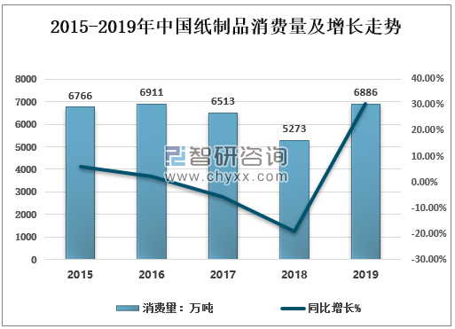 資料來源:中國造紙協會、智研咨詢整理 2018年全國紙制品消費量5273萬噸,較上年增長-19.04%2019年全國紙制品消費量6886萬噸,較上年增長30.59%; 2015-2019年中國紙制品消費量及增長走勢