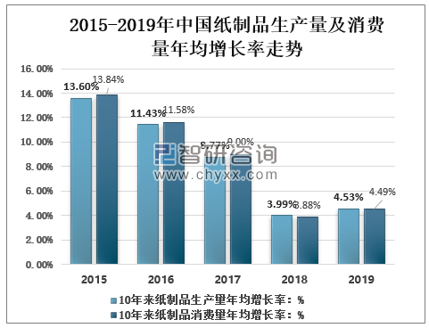 資料來源:中國造紙協會、智研咨詢整理 我國紙制品目前在市場上的需求量是相當大的,包裝紙、生活用紙、打包紙等等,紙制品的應用范圍相當廣泛。近年來由于相關政策等因素的影響,紙制品行業出現了不小的波動。2010~2019年,紙制品生產量年均增長率4.53%,消費量年均增長率4.49%。 2015-2019年中國紙制品生產量及消費量年均增長率走勢