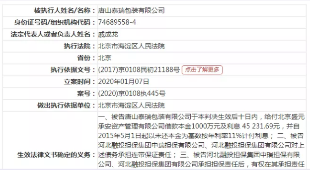另一家名為唐山泰瑞包裝有限公司,涉案金額約為1004萬元,主要為償還某資產管理公司的借款本金及利息。